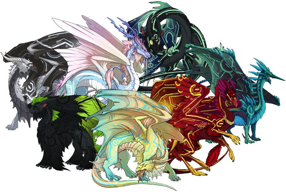 The Circuit gene covers a dragon's whole body in futuristic-looking patterns, reminiscent of integrated circuits. The patterns include solid, straight lines and circles of varying line widths; a gradient also appears on the hands, feet, and edges of the wings.