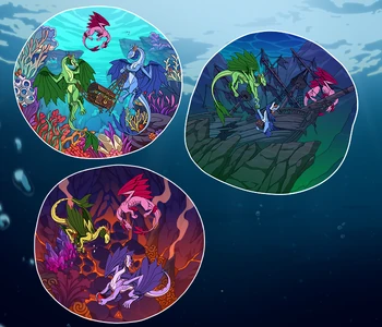 When it comes to settling in a lair, Fathoms are an anomaly—they don't! The breed has spent its entire history journeying across Sornieth, exploring the globe and all of its oceans. While this might ordinarily make for a lack of material possessions, Fathom dragons often take delight in adorning themselves with curiosities and keepsakes they find throughout their travels. The nature of the trinket doesn't matter—coral, treasure, pearls, seaweed, fish scales, and shells are just a few of the things that have been spotted on a Fathom while underway. A few elder dragons have even been known to serve as a home for entire ecosystems of algae, coral, and seaweed! Some Fathoms prefer shiny accessories, as these can help with visibility and sometimes may draw smaller ocean predators (a good indicator for locating schools of fish).